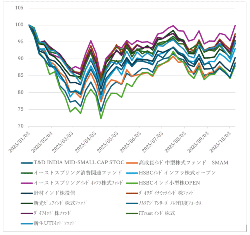 インド株式指数・年初来騰落率(2025年10月10日時点)