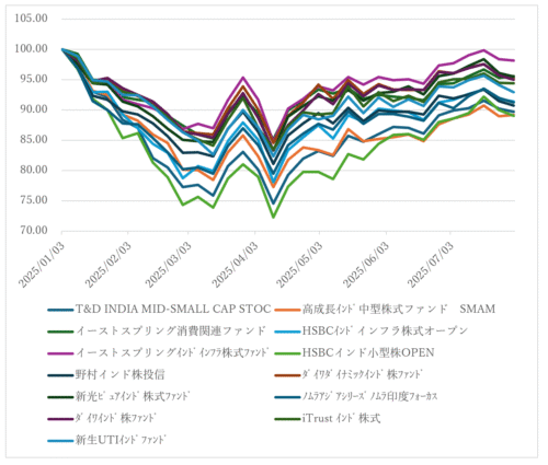 インド株式指数・年初来騰落率(2025年8月1日時点)
