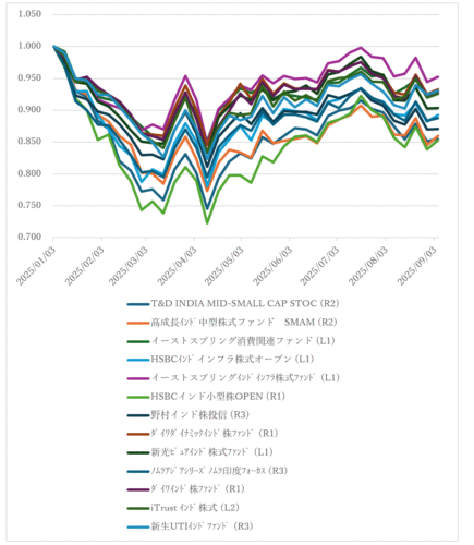 インド株式指数・年初来騰落率(2025年9月5日時点)