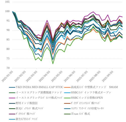 インド株式指数・年初来騰落率(2025年9月26日時点)