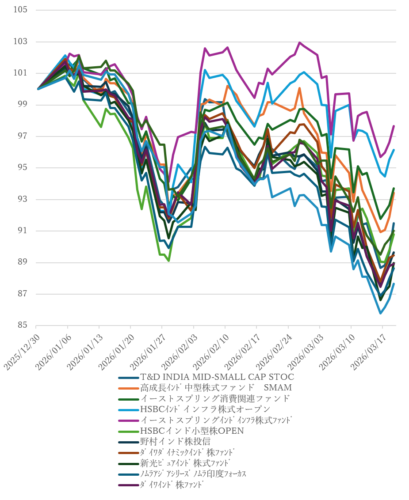 インド株式指数・年初来騰落率(2026年3月20日時点)